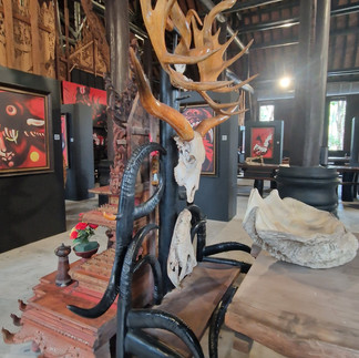 The black house is a striking building built by artist and architect Thawan Duchanee . He became internationally famous for his contraversial art, and then bought this land in his home village. He built his main building to house his art work, and added many more buildings and shrines to preserve the old Lanna style of architecture. His main theme are the dangers of doubt, fear, lust, lack of concentration, and he is famous for using animal remains to create furniture, floor coverings etc. That crocodile rug does not look as snuggly as a sheepskin one!