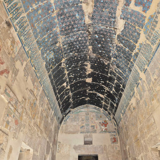 Queen Hatsheput's God protector is Hathor, who takes the form of a cow, and often appears as a woman's face with cows ears and or horns . She is the Goddess of love, joy music and fertility. One side chapel is dedicated to her and the art is beautiful.