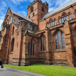 Superb examples of pots, helmets and shoe soles, plus a reconstruction of the wall, and a modern twist looking at recent and contemporary walls used to divide society, usually with few benefits and many disastrous consequences. Chris was happy because there was an interesting exhibition on the railways, and we both loved the tea room. Today’s treat was a delicious scone with Cornish clotted cream! We had a bus to catch back to Greenhead at 3.15, but had time to visit the red sandstone Cathedral, the second smallest in the UK. Started in 1122, it is almost dwarfed by it’s organ, which has over 4,000 pipes! Other striking features were these mediaeval painted panels, the 12th century east window, and the historic choir stalls. Carlisle is definitely a place worth visiting.