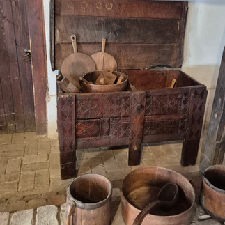 Amazingly, this house had 250 year old central heating. A central fire and then ceramic pipes into each room. Insulation was further helped by doors insulated with goatskins! The guest room, upstairs was beautiful, with wood panelling. The higher seating was for the guests, the family sat lower. The shutters were very adjustable too.